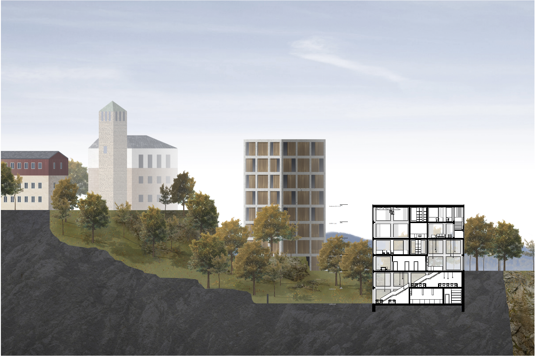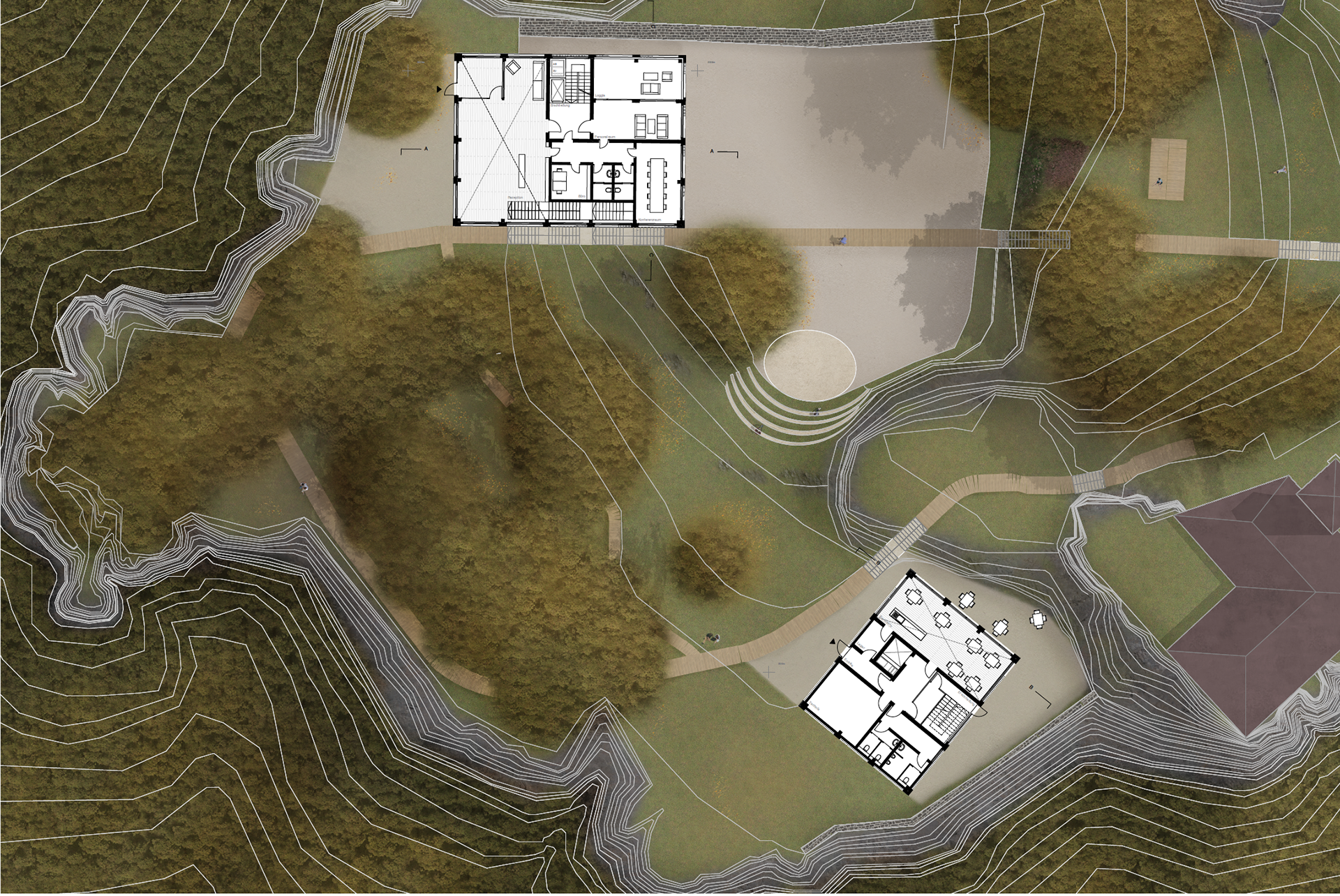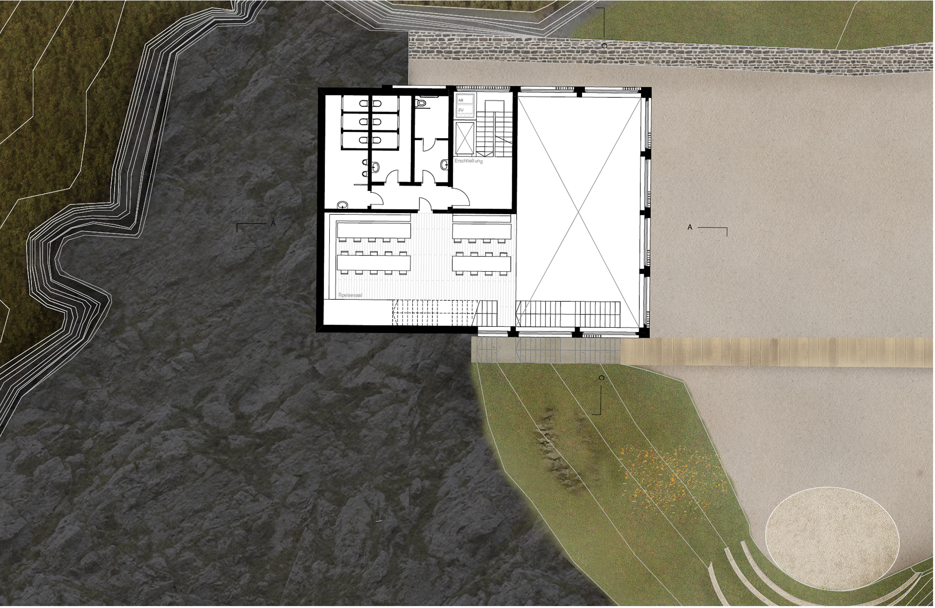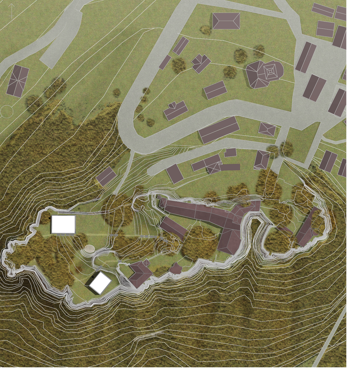 The place is intended to be a creative outlet for artists, musicians and theatre ensembles.The usage requirements allow to split into two buildings, one for nightly retreat and one for public spaces. They both enhance the existing buildings by expanding axes and pathways.The Night Tower is elevated but shielded by a ledge, the Day House introduces itself in the castle’s daily life.The appearance is based on the model of the early castles, with their readable structure and regular facade. While smaller rooms dominate the Night Tower, the Day House captivates due to its double-storey rooms and loggias.The generated area between the two buildings is used by the various groups staying at the hostel. The panoramic, most western point serves as subject for painters and photographers, a greek theater provides a scene for theatre performances and the natural terrace poses a site for musical performances.