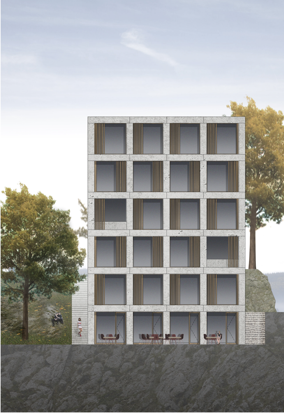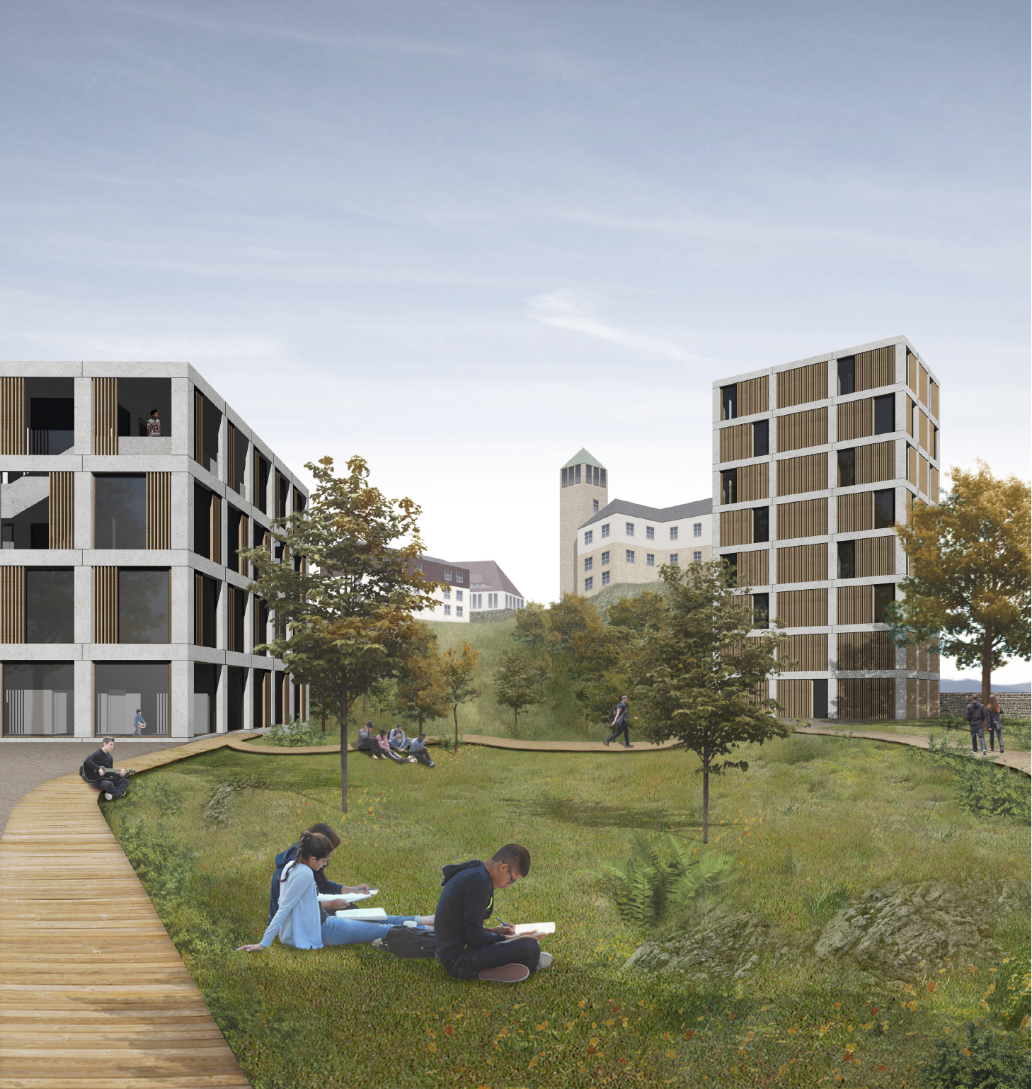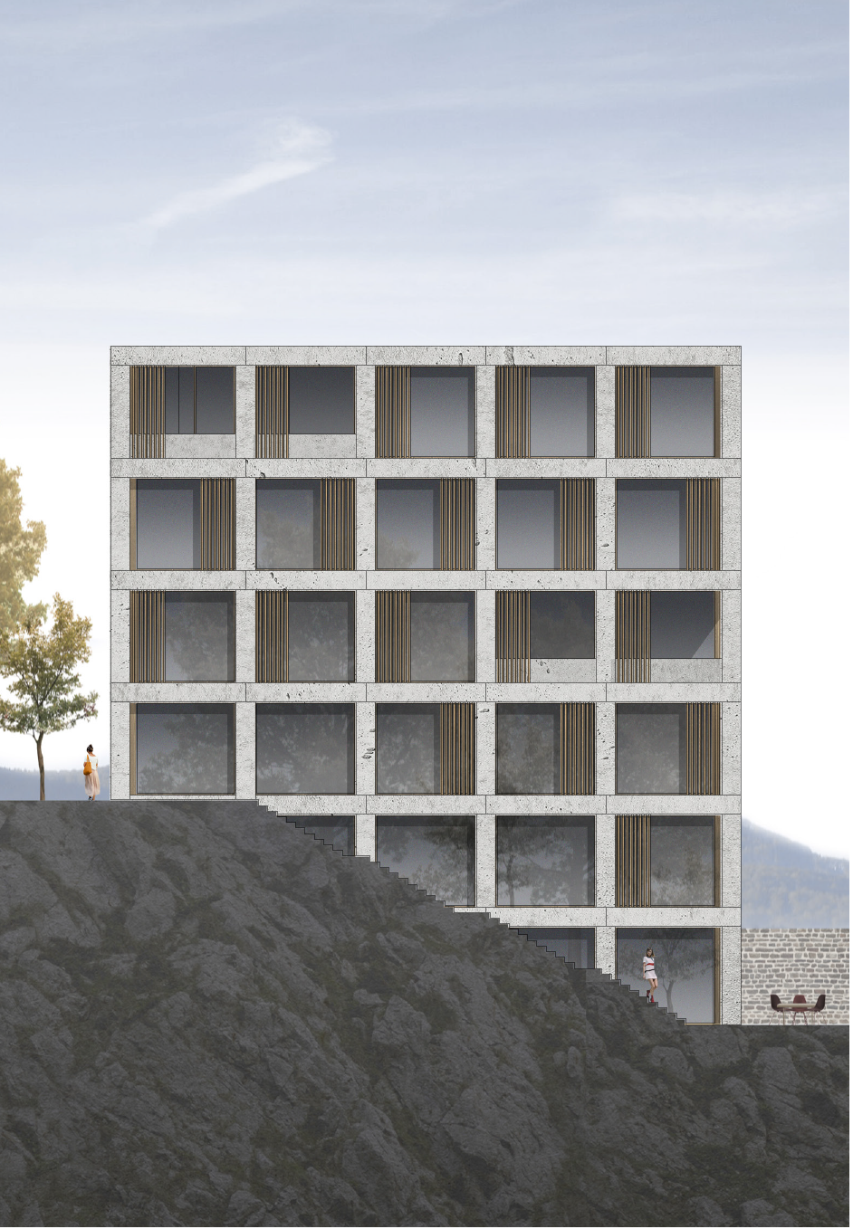 The place is intended to be a creative outlet for artists, musicians and theatre ensembles.The usage requirements allow to split into two buildings, one for nightly retreat and one for public spaces. They both enhance the existing buildings by expanding axes and pathways.The Night Tower is elevated but shielded by a ledge, the Day House introduces itself in the castle’s daily life.The appearance is based on the model of the early castles, with their readable structure and regular facade. While smaller rooms dominate the Night Tower, the Day House captivates due to its double-storey rooms and loggias.The generated area between the two buildings is used by the various groups staying at the hostel. The panoramic, most western point serves as subject for painters and photographers, a greek theater provides a scene for theatre performances and the natural terrace poses a site for musical performances.