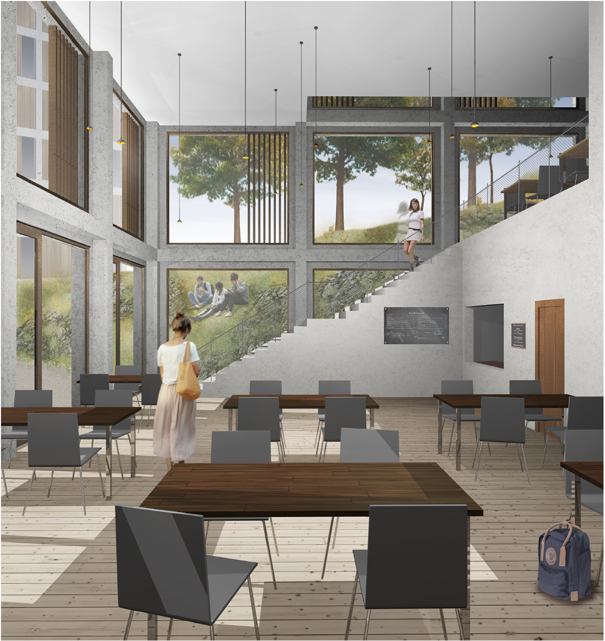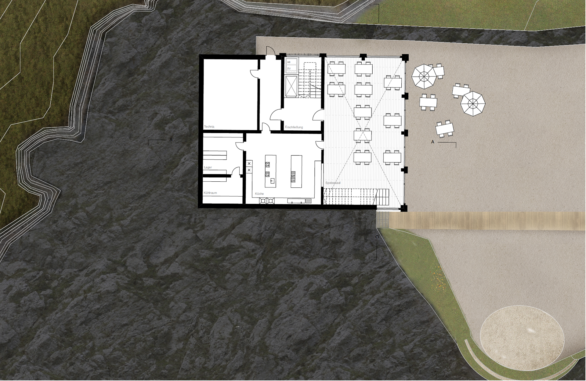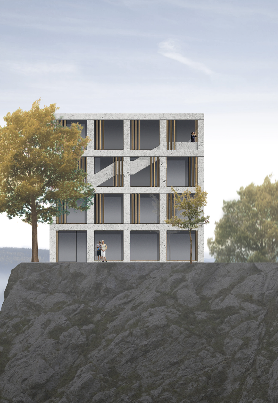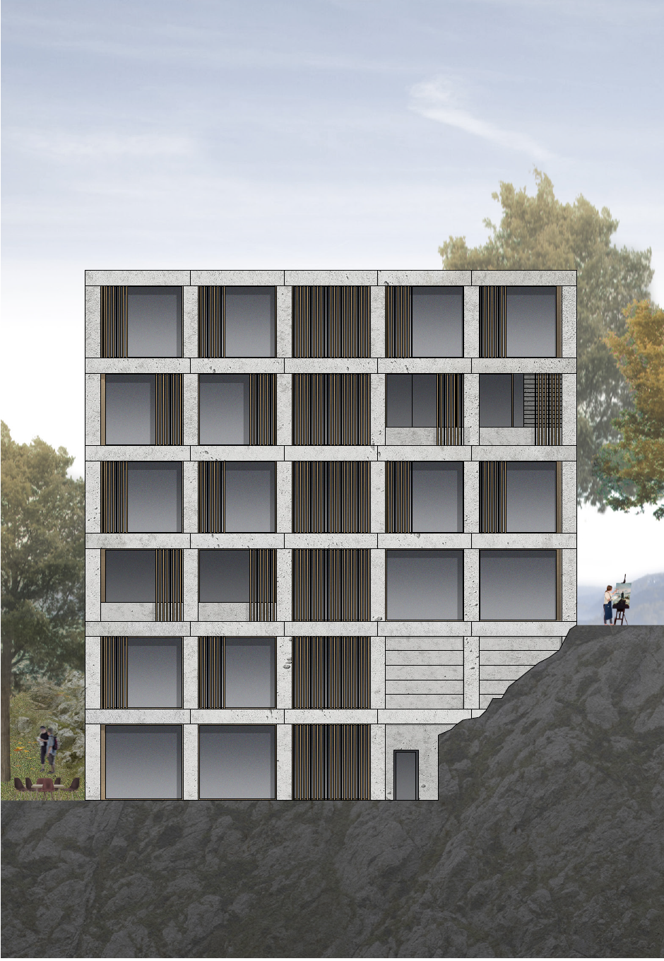 The place is intended to be a creative outlet for artists, musicians and theatre ensembles.The usage requirements allow to split into two buildings, one for nightly retreat and one for public spaces. They both enhance the existing buildings by expanding axes and pathways.The Night Tower is elevated but shielded by a ledge, the Day House introduces itself in the castle’s daily life.The appearance is based on the model of the early castles, with their readable structure and regular facade. While smaller rooms dominate the Night Tower, the Day House captivates due to its double-storey rooms and loggias.The generated area between the two buildings is used by the various groups staying at the hostel. The panoramic, most western point serves as subject for painters and photographers, a greek theater provides a scene for theatre performances and the natural terrace poses a site for musical performances.